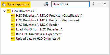 Once you have installed the extension, restart KNIME Analytics Platform and you should see the following nodes in the node repository under H2O Driverless AI: