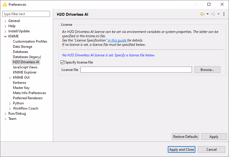 - Within KNIME, navigate to File → Preferences → KNIME → H2O Driverless AI and upload the