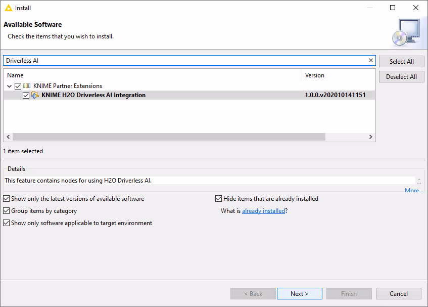 You can install the KNIME H2O Driverless AI Integration extension by drag and drop from KNIME Hub or go to File → Install KNIME Extensions... in KNIME Analytics Platform toolbar and select KNIME H2O Driverless AI Integration extension under KNIME Partner Extensions.