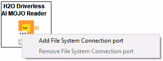If you want a more dynamic connection in regards to the workflow, you can click the three dots on the node and click Add Driverless AI Dataset Connection port for use with the Upload data to H2O Driverless AI node. This node will use the connection information from the previous node to pull MOJO information from your H2O Driverless AI instance.
