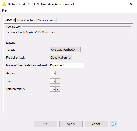 The Prediction Task field will dictate whether the Experiment is catering to a Regression problem or a Classification problem. This is important when using the H2O Driverless AI MOJO Predictor nodes.