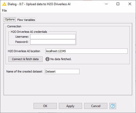In order to upload KNIME data tables to H2O Driverless AI, connect your workflow to the Upload data to H2O Driverless AI node. Right-click the node and select Configure... from the context menu. The node configuration dialog opens: