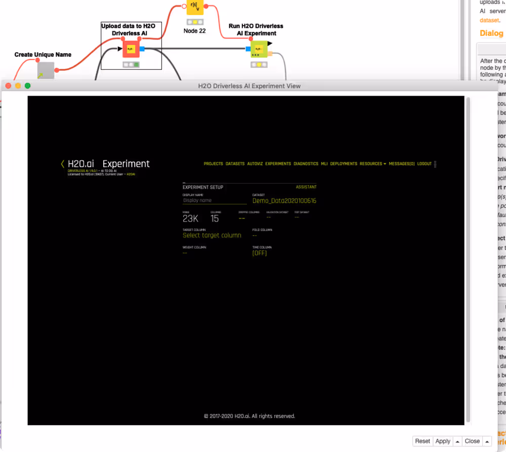 This guide explains how to connect KNIME Analytics Platform with H2O Driverless AI, allowing you to push tables from KNIME to H2O, run experiments from KNIME workflows, or to read in H2O Driverless AI MOJO files for use in KNIME workflows. The following sections will explain how to install the required extension and how to integrate the two solutions together.