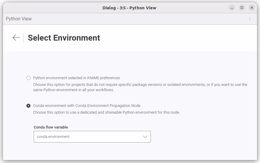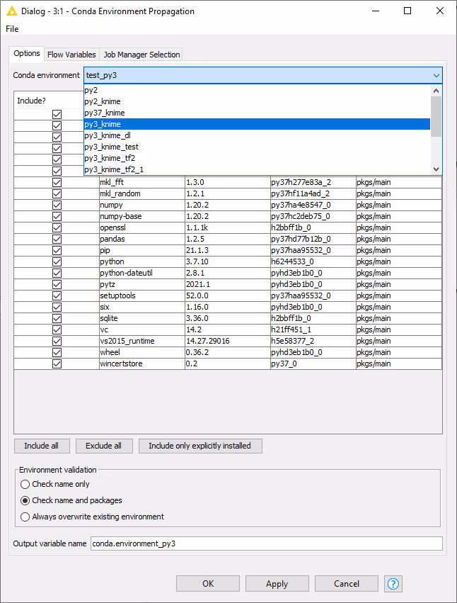 - The Conda Environment Propagation node outputs a flow variable which contains the necessary information about the Python environment (i.e. the name of the environment and the respective installed packages and versions). The flow variable has conda.environment as the default name, but you can specify a custom name. This way you can avoid name collisions that may occur when employing multiple Conda Environment Propagation nodes in a single workflow.