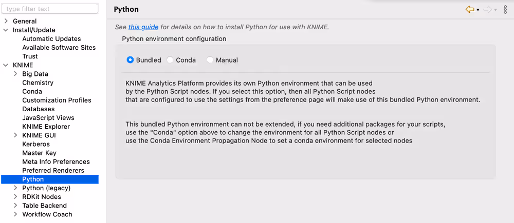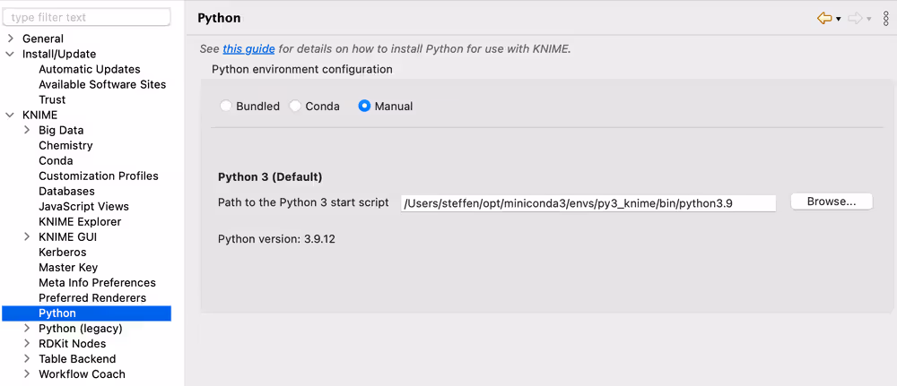 Besides setting up Python for your entire KNIME workspace via the Preferences page, you can also use the Conda Environment Propagation node to configure custom Python environments and then propagate them to downstream Python nodes. This node also allows you to bundle these environments together with your workflows, making it easy for others to replicate the exact same environment that the workflow is meant to be executed in. This makes workflows containing Python nodes significantly more portable and less error-prone.
