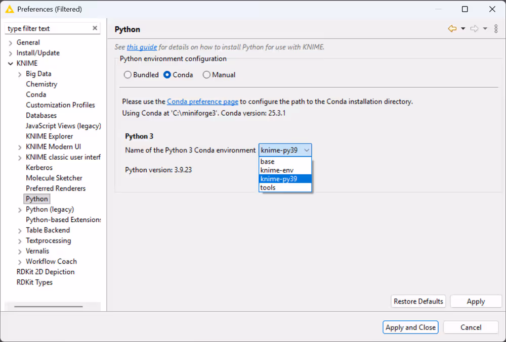 - On your local machine, you should have Conda set up and configured in the Preferences of the KNIME Python Integration as described in the Prerequisites section