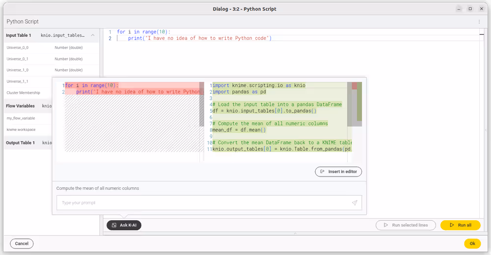 The "Ask K-AI" feature within the KNIME Python Scripting Node is an advanced AI-assisted code generation tool. When activated, you can input prompts specifying the intended functionality of the code. The AI assistant has contextual awareness of the KNIME Python API, the input data's structure, and the current script content in the editor.