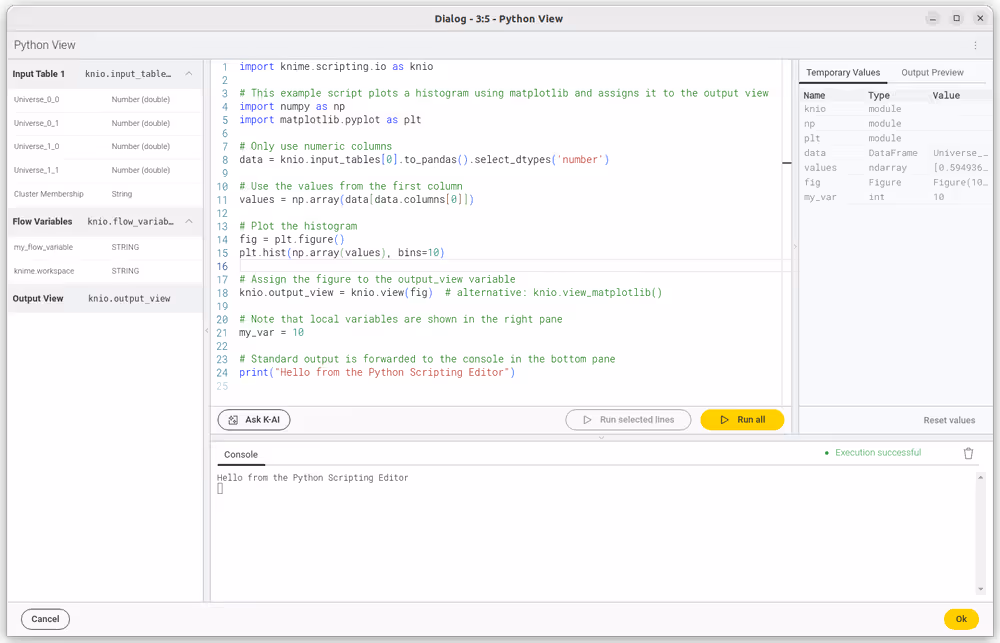 The Python View node can be used to create views using Python scripts. It has the same configurable input ports as the Python Script node and uses the same API to access the input data. However, the Python View node has no output ports except for one optional image output port.