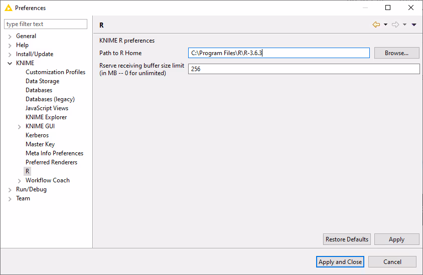 - Finally, configure the KNIME Interactive R Statistics Integration. In KNIME Analytics Platform go to File → Preferences. From the list on the left, select R under KNIME and the following dialog opens: