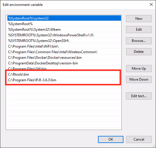 - Please make sure that both R bin path and Rtools path are added to the Windows Path variable. From the Start menu open the Control Panel and click System. In the dialog that opens, click Advanced system settings in the left column. This opens the System Properties window. Here, click Environment Variables.... Then in the System variables section click Edit... to inspect and, if required, change the variable Path. Add the paths to R and Rtools bin folders, if they are not yet listed.