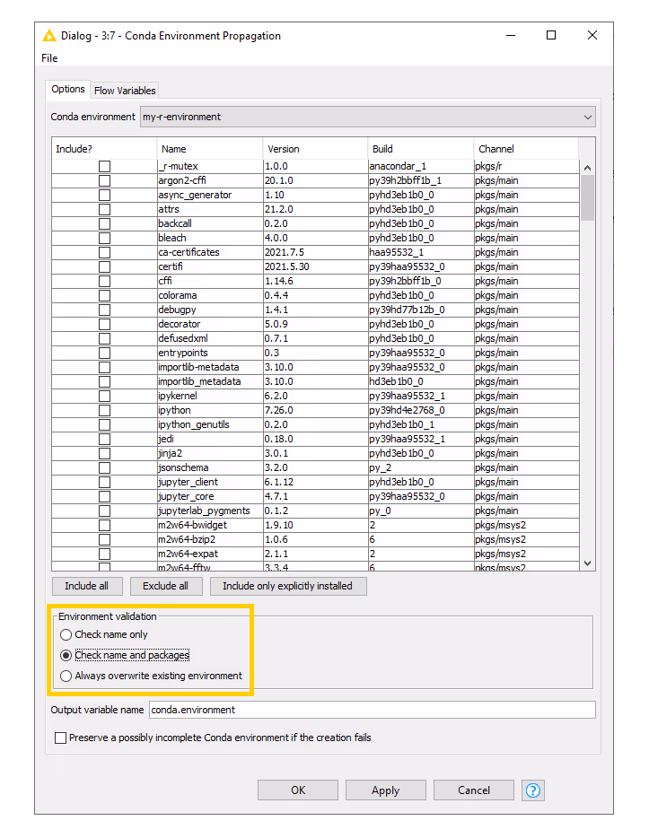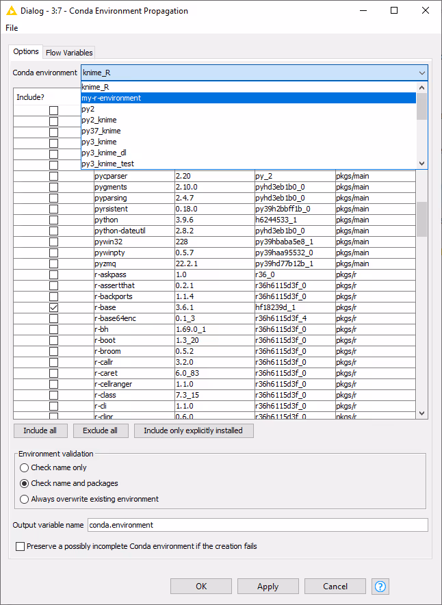- The Conda Environment Propagation node outputs a flow variable which contains the necessary information about the R environment (i.e. the name of the environment and the respective installed packages and versions). The flow variable has