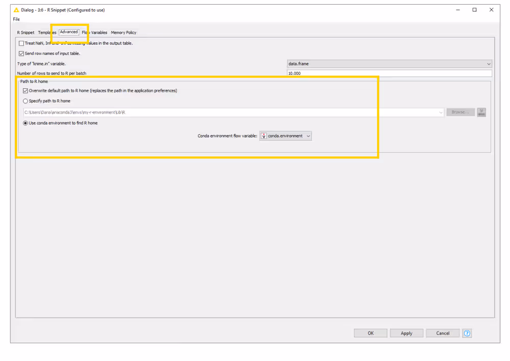 Besides setting up R Home for your entire KNIME workspace via the Preference page, you can also use the Conda Environment Propagation node to set up specific conda environments to propagate the environment to downstream R scripting nodes. This node also allows you to export the specific conda environment together with your workflows.