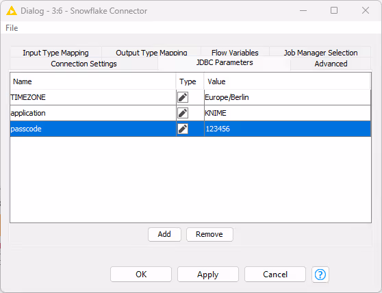 - Add the passcode parameter to the JDBC Parameters tab of the node configuration dialog with the passcode from Duo as value.