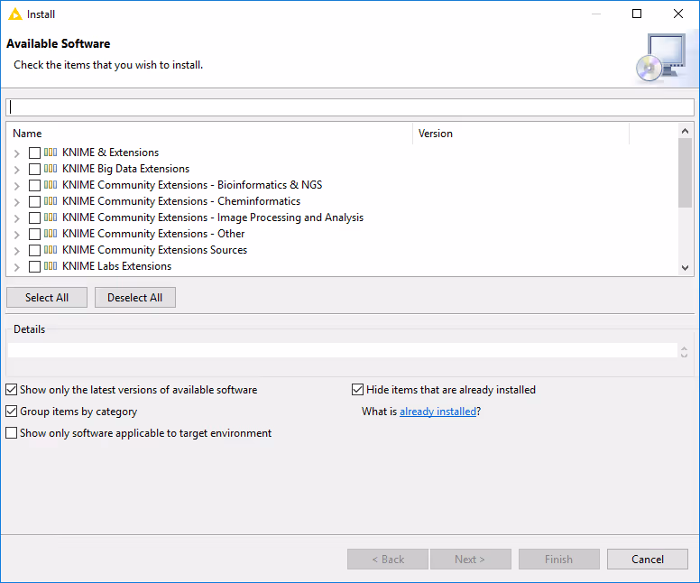 - Click File on the menu bar and then Install KNIME Extensions…. The dialog shown in the figure opens.