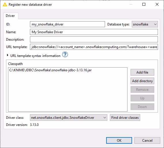 The KNIME Snowflake Integration comes with a built-in Snowflake driver and is thus ready to go. However because of some special circumstances you might be required to use a particular version of the driver which you can do by manually registering your own JDBC driver.