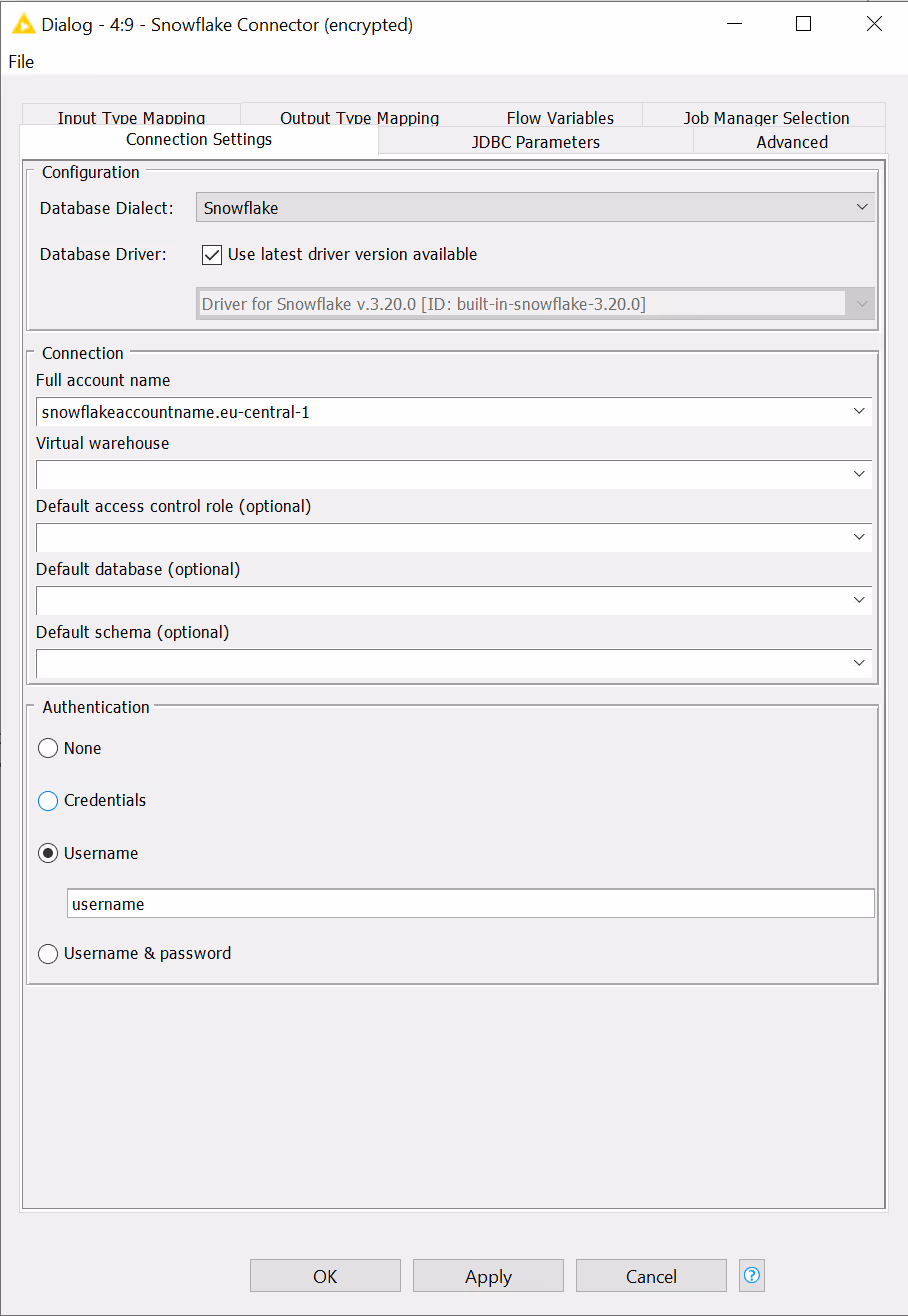 - Enter your username and password in the Authentication section of the Snowflake Connector node dialog.
